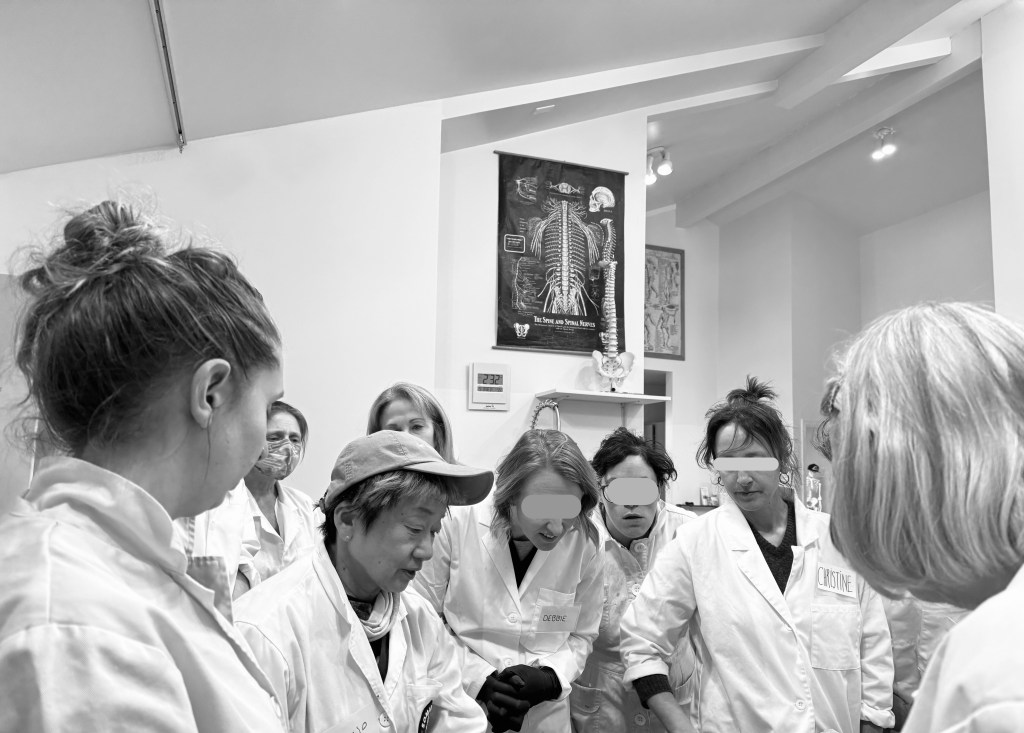 Hedley先生がコロナ時に研究室に閉じこもり17ヶ月にわたって実施した「AからZまでの解剖学」プロジェクトと2023年の神経解剖プロジェクトでいっしょにアシスタントを務めたFauna Moore先生はファシア研究学会によりドイツのグーベンで行われたファシア・ネット・プラスティネーション・プロジェクトの立ち上げ時のメンバーの一人でもあり、ノースカロライナ州で解剖研究所で教育プログラムを担当されており、ファシア研究で著名なイタリアのカーラ・スタッコ博士のワークショップにも度々参加されています。Hedley先生の実習時に何度もお会いしたLauri Nemetz先生もファシア・ネット・プラスティネーション・プロジェクトに関与され、The Myofascial System in Form and Movement を出版されており、2014年から2021年までトム・マイヤーズのアナトミー・トレインズ解剖ラボでアシスタントを務められていました。彼女は日本からの学生グループを何度も教えた経験があるので、ご存じの方もいらっしゃると思います。現在はヨガ・アナトミーのLeslie Kaminoff先生と呼吸に重点を置いたヨガインストラクター向けの解剖実習ワークショップを主宰しておられます。他にもGil Hedley先生のIntegral Anatomy(統合解剖学)ファミリーのメンバーの見覚えのある顔が何人も見られました。