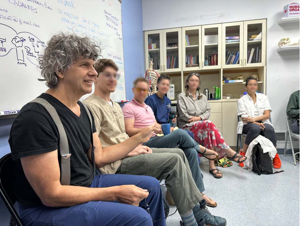 毎朝、解剖実習の前に隣接する教室で前日の経験についてや、考察についてディスカッションが行われます。人体解剖が初めての参加者にとっては、精神的な影響が大きいこともあるので、自分の感じたことを表現する場所を持つことは非常に重要です。