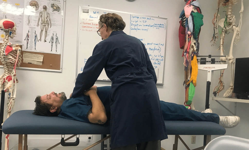 解剖実習室の隣の教室で参加者から施術を受けるJim Pulciani所長。参加者の多くが手技施術者なので、よくこのように施術の交換が行われています。施術者の能力は皮膚を通してどれだけ敏感に内部の構造を読み取るかに左右されます。